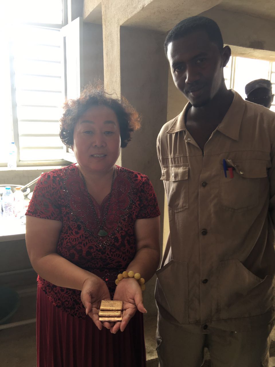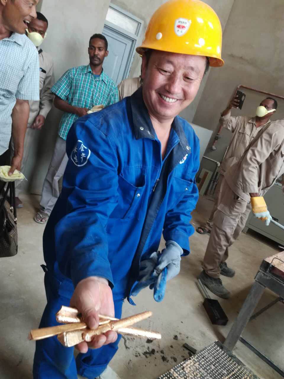 非洲200噸金礦于2017.7.17日第一批金條順利出爐,礦業部,安全部,礦主及金鵬和在場的所有的人都露出幸福笑臉,金鵬公司在茫茫沙漠中又建造一座金庫!