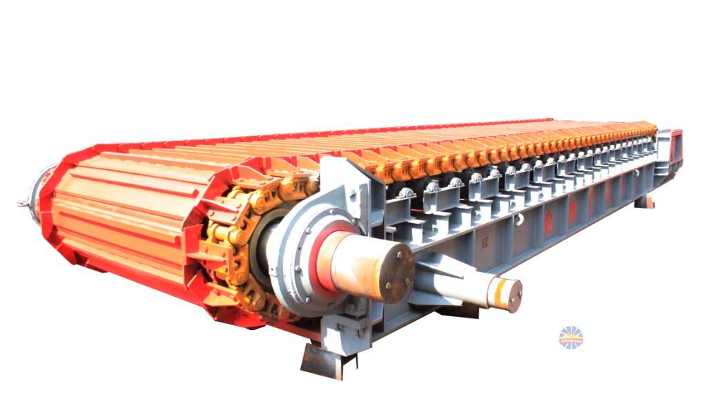 采用節距為228.6mm的高強度模鍛鏈條為牽引件,兩根鏈條繞過安裝在機體頭部的一對驅動鏈輪和機體尾部的一對張緊輪聯成封閉形回路,在兩排鏈條的每個鏈節上裝配了相互交迭的、重型結構的輸送槽而成為一個連續的能夠運載物料的輸送線路。其自重和物料的重量由安裝在機體上的多排支重輪、鏈托輪和滑道梁支承。傳動系統經交流變頻調速電動機聯接減速機,再由漲套與驅動裝置直聯驅動運載機構低速運行。將尾部料倉卸入的物料沿輸送線路運至機體的前方排出,實現向下方的工作機械連續均勻喂料的目的.