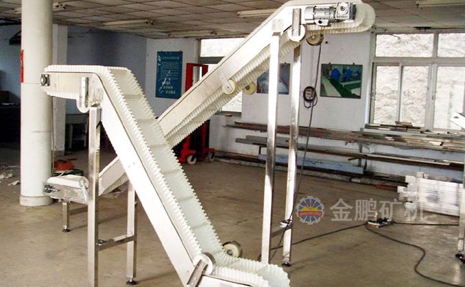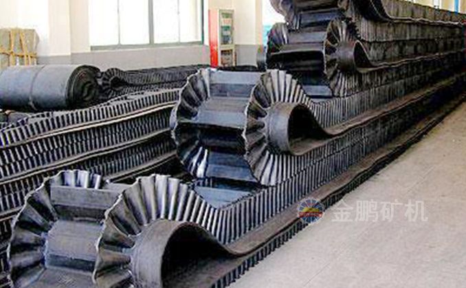 波狀擋邊輸送帶中以大傾角波狀擋邊輸送帶最有名,大傾角波狀擋邊輸送帶又叫裙邊隔板輸送帶,是由基帶、擋邊、橫隔板3部分組成。擋邊起防止物料測滑撒落的作用。為便于繞過滾筒,檔邊設(shè)計成波紋狀;橫隔板的作用是承托物料,為了實現(xiàn)大傾角輸送,采用T型TC型。檔邊和橫隔板是用二次硫化的方法與基帶連接的,具有很高的連接強(qiáng)度。